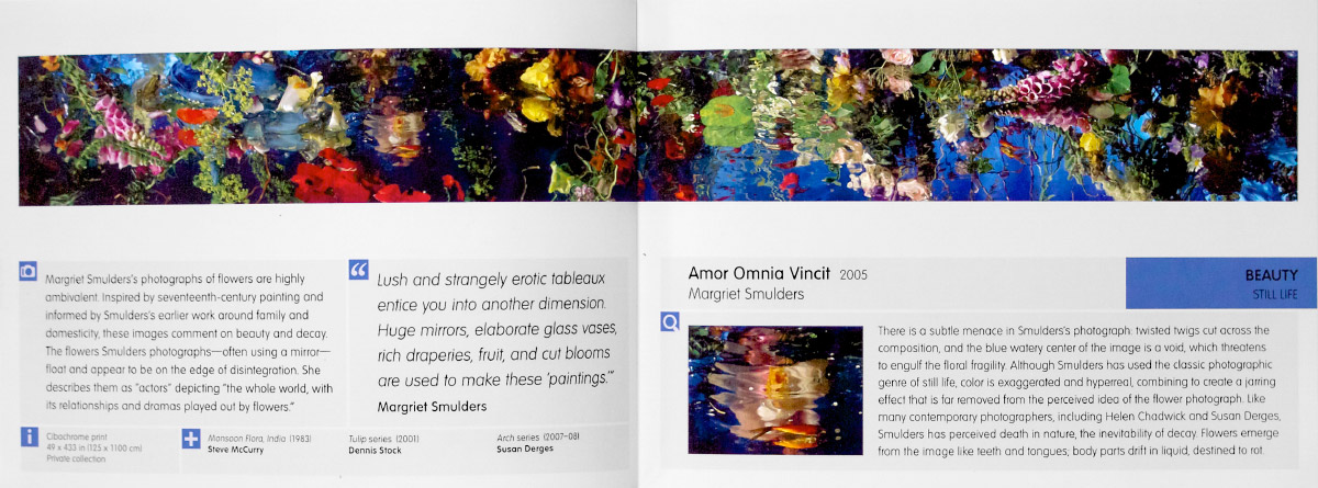 “There is a subtle menace in Smulders’s photograph: twisted twigs cut across the composition, and the blue watery center of the image is a void, which threatens to engulf the floral fragility. Although Smulders has used the classic photographic genre of still life, color is exaggerated and hyperreal, combining to create a jarring effect that is far removed from the perceived idea of the flower photograph. Like many contemporary photographers, including Helen Chadwick and Susan Derges, Smulders has perceived death in nature, the inevitability of decay. Flowers emerge from the image like teeth and tongues; body parts drift in liquid, destined to rot.”