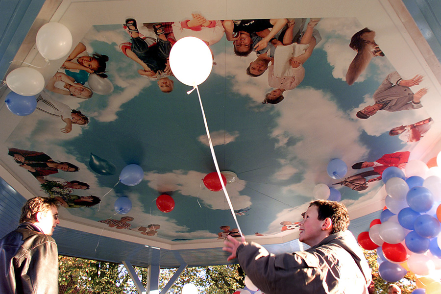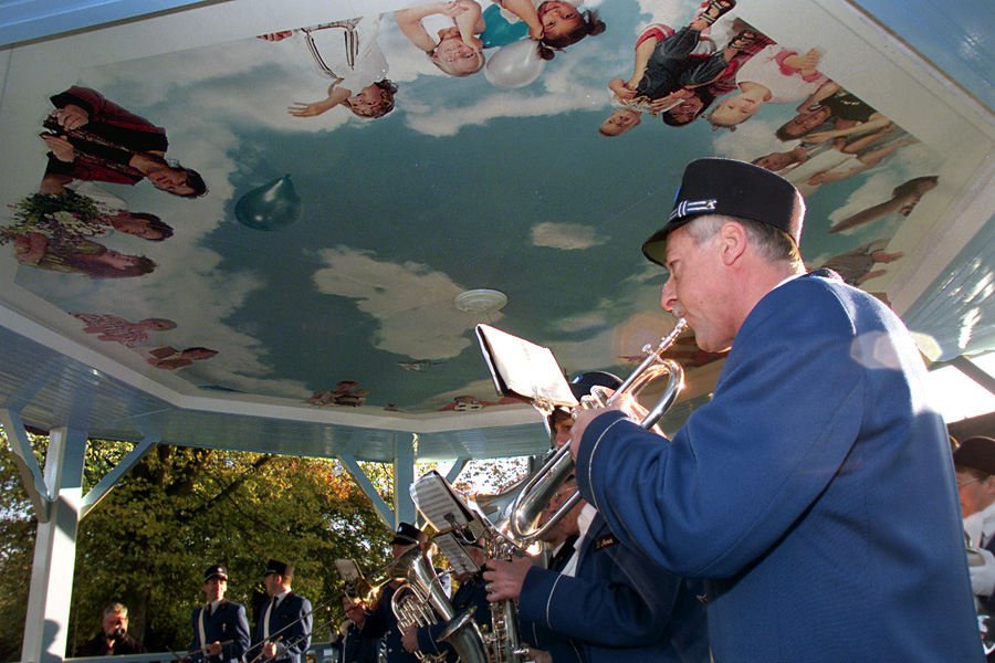 For the municipality of Wychen I made in the little village Bergharen a big photograph of 5,5 meter diameter. Inspired by Italian ceiling-paintings of the 17th century, several residents of the village were asked to model for a big ceiling photograph on the bandstand in the middle of their village. Right now they are looking downstairs in the bandstand listening to the music. I had asked to have the whole building painted light blue to emphasise the feeling of being ‘in the clouds’. When the work was unveiled the whole village turned up complete with the local brassband.