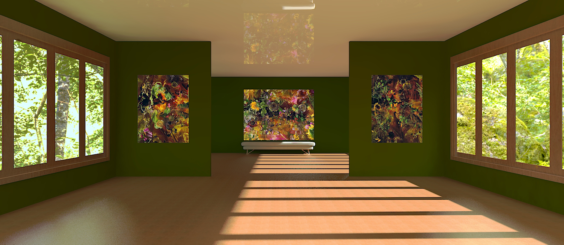 Below the artworks from the series “It shines, it whispers” (2014) form a sunflower triptych. Whole walls can be produced in which you seem to walk in a wonder landscape.