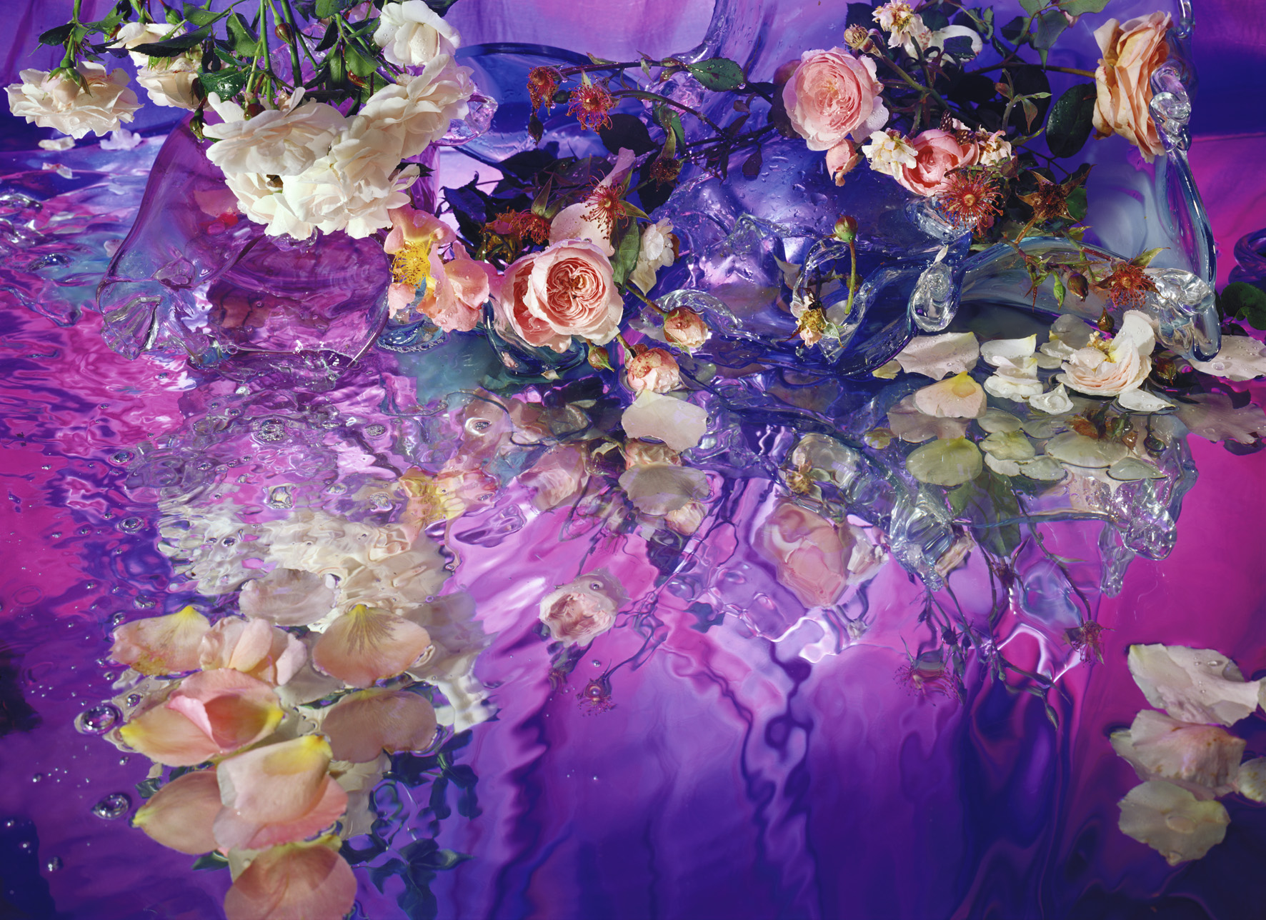 Lilila, 2005, was a case in point. Pink and white fully bloomed roses kissed with dabs of crimson and lemon yellows seemed to tumble from everywhere at once — a disorienting array of loose petals, leafy stems, and glimpses of a barely visible, transparent, glass vase. The entire composition was asymmetrically mirrored in a rippling pool of water suffused with a brilliant light that shaded from deep indigos to purple hues to lilac. The reflections were broken and faceted, suggesting the kind of frozen, instantaneous moment that was the obsession of Baroque painters. Think of Holofernes’ blood ejaculating from his neck as Judith beheads him in Caravaggio’s late-sixteenth-century painting. Time is compressed to its narrowest expression. The reference to Baroque painting is not accidental. Smulders has looked to the Dutch Golden Age painters of the seventeenth and eighteenth centuries as well as to Renaissance models throughout her career as both a portrait photographer and a photographer of dynamic still lifes.