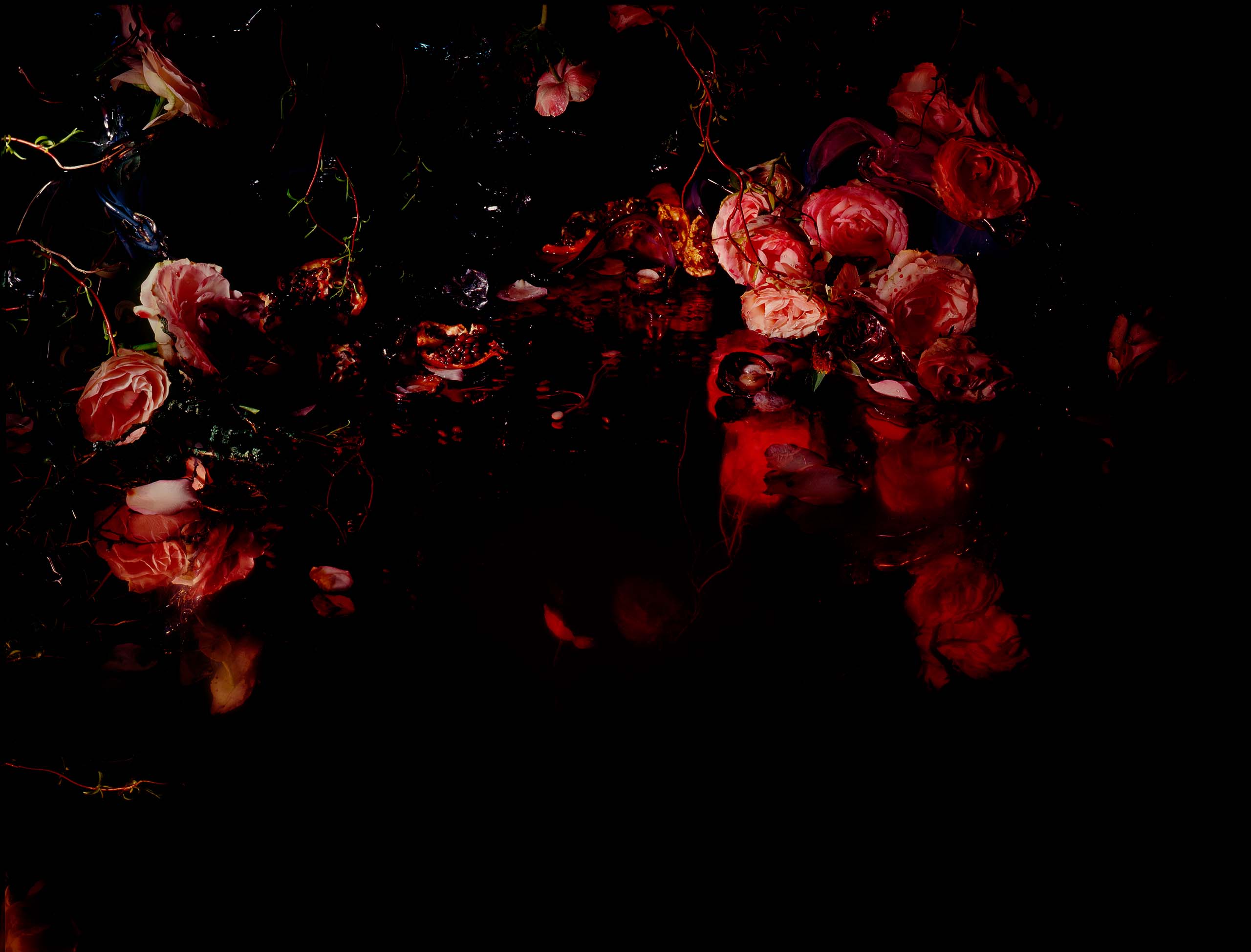 Margriet Smulders’ photographs could and should be seen within this historical context. The dark tonality and the representational precision of Bloody Roses are formally reminiscent of paintings by Rembrandt or Caravaggio. We can also draw a thematic comparison to the baroque still lifes of 17th century Holland and Flanders which have now been translated by the Dutch photographer into contemporary timelessness. An underlying play with flowers and fruits, water and glass, surfaces and visual depths is equally subtle as vexing. Her opulent, sensually morbid orchestrations in natural yet intensive colours both fascinate and disturb. With her Bloody Roses and other works, Margriet Smulders entices us into visual worlds that are at the same time enigmatic and enchanting.