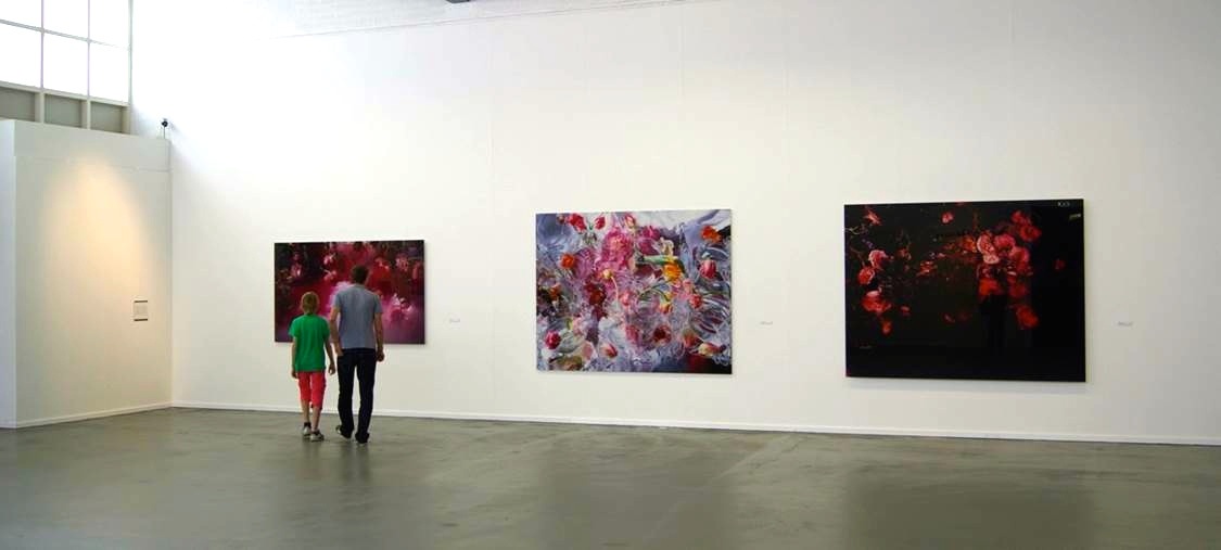 Her still lifes which are created in formats up to ten meters wide, remain mere excerpts of what seems to be an even greater reality beyond the picture’s frame. With her large formats she portrays the flowers in close to original dimensions so that visually, they also stand for themselves. The unusually arranged visual spaces reflect to create thematic doublings and optical refraction. The amorphous glass structures in the water sometimes give the impression of ice formations, intrinsically disconnecting this and the other still lifes from both time and reality. Within the reflection, the blossoms dissipate into a soft blur.