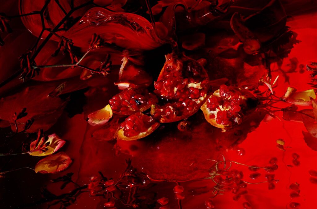 With blood, violence and death we return to the underworld. The pomegranate is primarily Hades’ fruit, the god that governs the underworld. If Persephone, who was abducted by Hades, had not been tricked into eating the seeds of the pomegranate, Mercury would have succeeded in his mission of bringing her back. Now she is forced to return to the underworld in rhythm with the seasons which brings us back to the beginning of our story that of the pomegranate as the source of fatal attraction.
