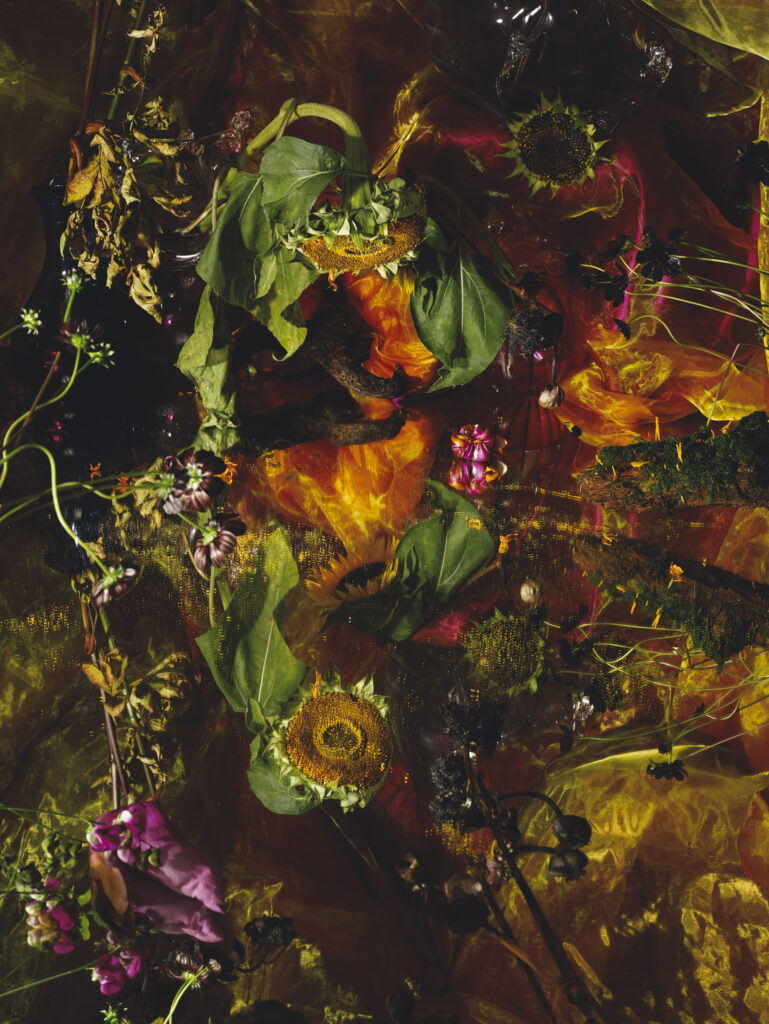 This work, Speak not, Reply not, Do not Speak a Word, 2014, one of a tryptich, is made to comfort people who lost their dearest ones. The inspiration to make this triptych not only came from the blooming sunflowers on the 17th of July 2014. I was motivated to soften the horror of the MH17 disaster and the fate of volunteers looking for remnants of bodies between the sunflowers in East-Ukraine. The sunflower is the national symbol of Ukraine.