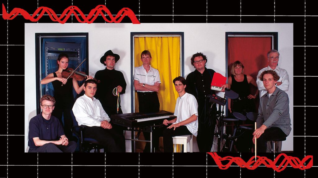 Staand van links naar rechts: drs. Renée Timmers, aio; dr. Peter Desain, projectleider; Gerard van Oijen, elektronicus; dr. Henkjan Honing, projectleider; Yvonne Schouten, secretariaat; Dirk Povel, adviseur Zittend van links naar rechts: dr. Luke Windsor, postdoc UK; dr. Ilya Shmulevich, postdoc USA; drs. Rinus Aarts, aoi; drs. Hank Heijink, aoi